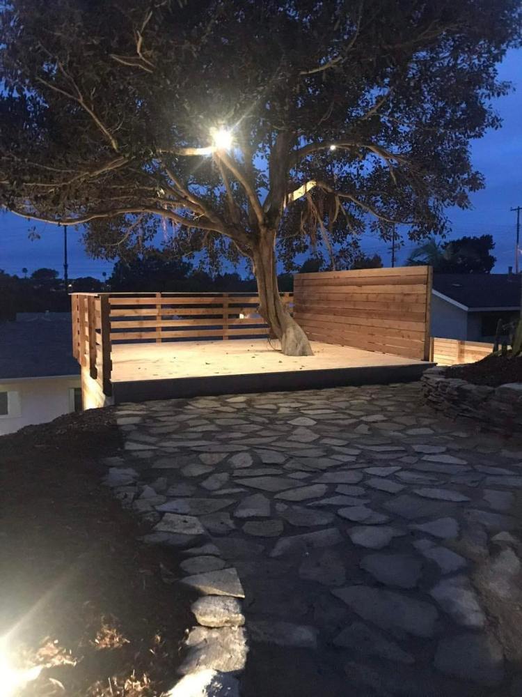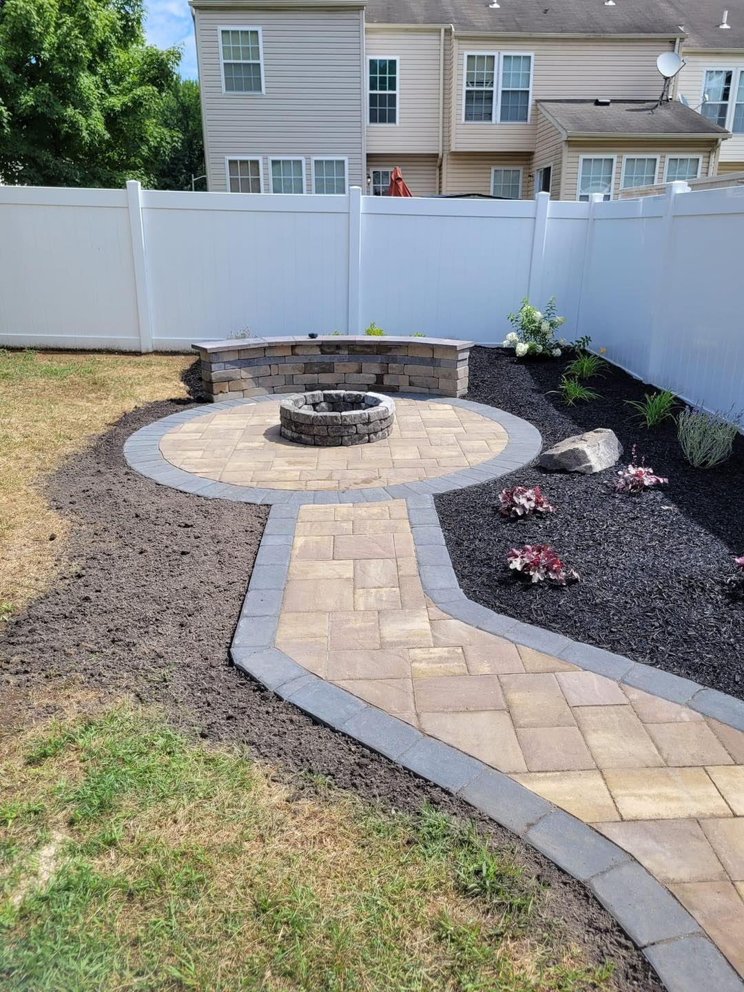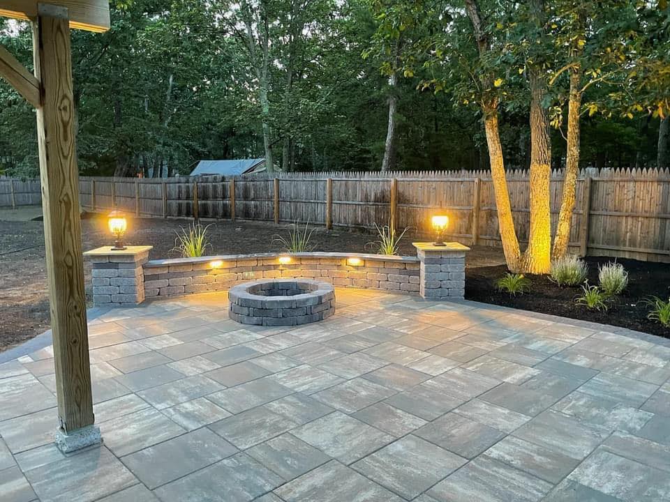 This project included an EP Henry patio, seat wall, pillars and lighting along with a fire pit.